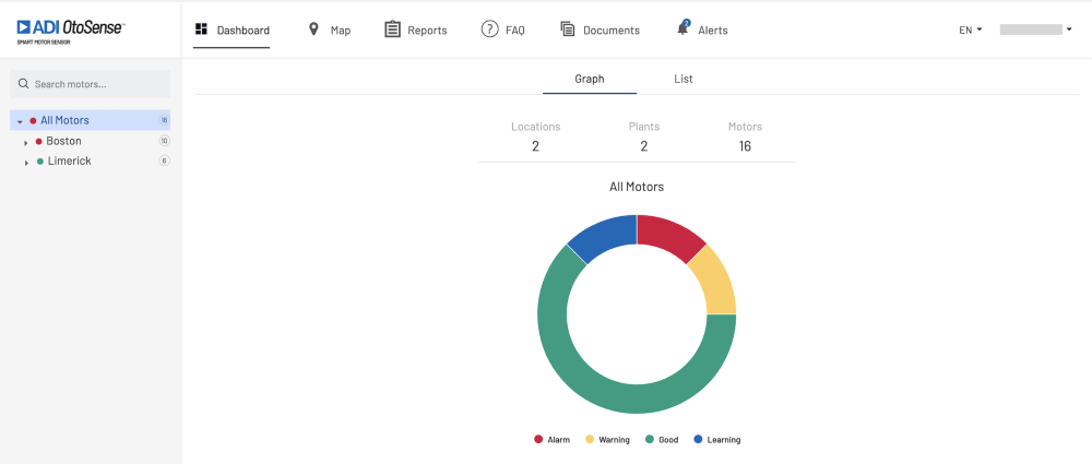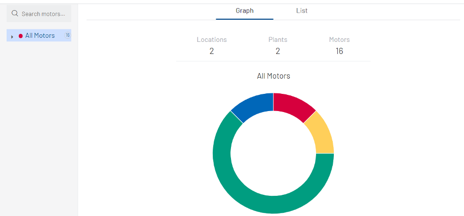 Dans le menu déroulant, l’indicateur numérique à droite affiche le nombre de moteurs surveillés à chaque niveau de localisation, tandis que les points de couleur affichent les informations les plus pertinentes sur l’état des moteurs à cet endroit.
