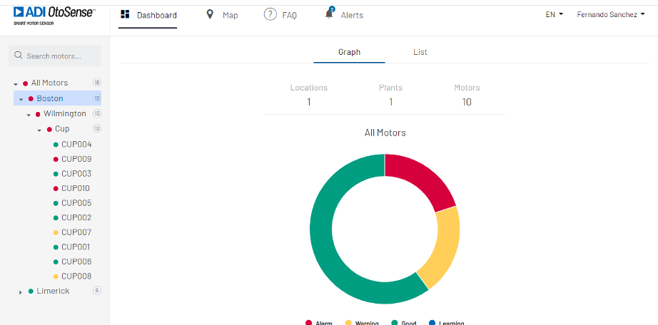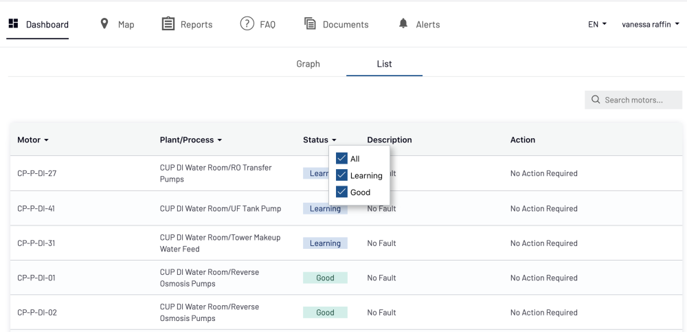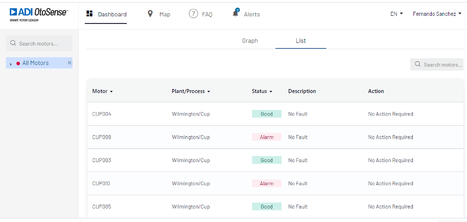 Le tableau de bord comprend un Moteur de recherche (Figure 1a) et un menu qui peut s’étendre et se réduire (Figure 1b). Ce menu contient la liste de tous les moteurs actuellement surveillés par les appareils SMS, avec la ville, le nom de l’usine, le processus et le nom du moteur.