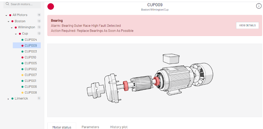 Ici (Figure 4), nous constatons que le moteur CUP009, situé dans une usine à Wilmington, Boston, nécessite une attention immédiate car les roulements sont défaillants.