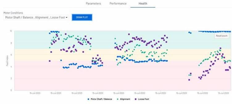 Chaque point représente l’indice de santé pour chaque échantillon de données collecté toutes les 20 minutes pour la composante choisie : vous pouvez zoomer sur une date et une heure particulières en sélectionnant les points que vous souhaitez examiner de plus près (cliquez-glissez votre souris sur le graphique pour sélectionner ces points).